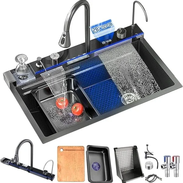 نمایشگر دمای آب، تنظیم دمای اب با ولومی، شیر آبشاری لمسی، شیر شاوری لمسی قفل کودک لمسی امکان باز و بسته کردن آب با اشاره دست (تاچ لس)، سیفون اتوماتیک، آبچکان کارد و چنگال، تخته کار چوبی، سبد استیل میوه شور، سبد استیل آبچکان، جامایع تمام استیل یا لیوان شور