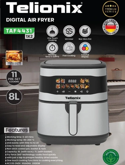 سرخ کن دیجیتال Telionix TAF4431 یک هواپز قدرتمند و مدرن از سری Premium این برند است که با ظرفیت 8 لیتری، توان 2000 وات و 11 برنامه پخت پیشفرض، امکان پخت سریع، یکنواخت و سالم انواع غذاها را فراهم میکند.