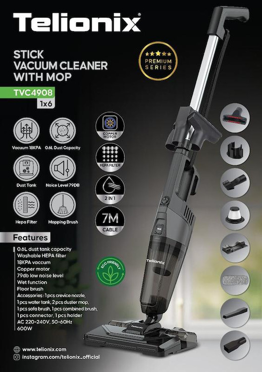 جاروبرقی ایستاده و تیدار تلیونیکس مدل TVC4908 با قدرت مکش بالا، موتور مسی، فیلتر HEPA، قابلیت تیکشی و اقلام جانبی متنوع، انتخابی کامل و مقرونبهصرفه برای نظافت روزمره و حرفهای منزل است. اگر بهدنبال یک جاروبرقی چندکاره با قیمت مناسب و کارایی بالا هستید، این مدل گزینهای بینظیر برای شما خواهد بود.