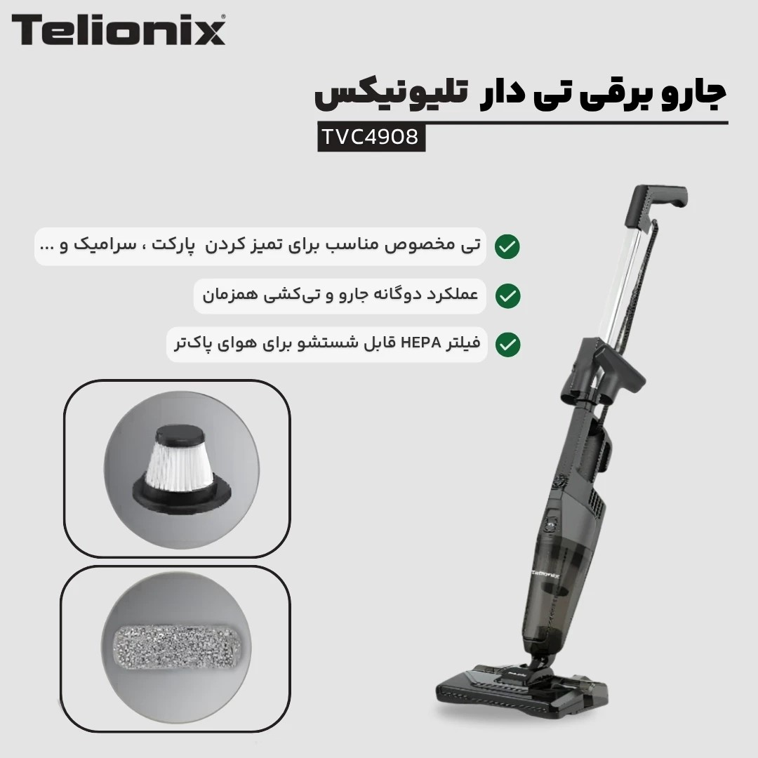 جاروبرقی ایستاده و تیدار تلیونیکس مدل TVC4908 با قدرت مکش بالا، موتور مسی، فیلتر HEPA، قابلیت تیکشی و اقلام جانبی متنوع، انتخابی کامل و مقرونبهصرفه برای نظافت روزمره و حرفهای منزل است. اگر بهدنبال یک جاروبرقی چندکاره با قیمت مناسب و کارایی بالا هستید، این مدل گزینهای بینظیر برای شما خواهد بود.