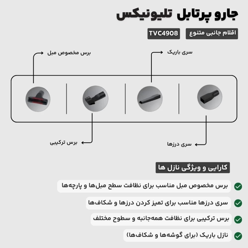 جاروبرقی ایستاده تلیونیکس TVC4908 به مجموعهای کامل از اقلام جانبی مجهز است که دستگاه را به یک ابزار نظافتی همهکاره تبدیل میکند، از جمله: