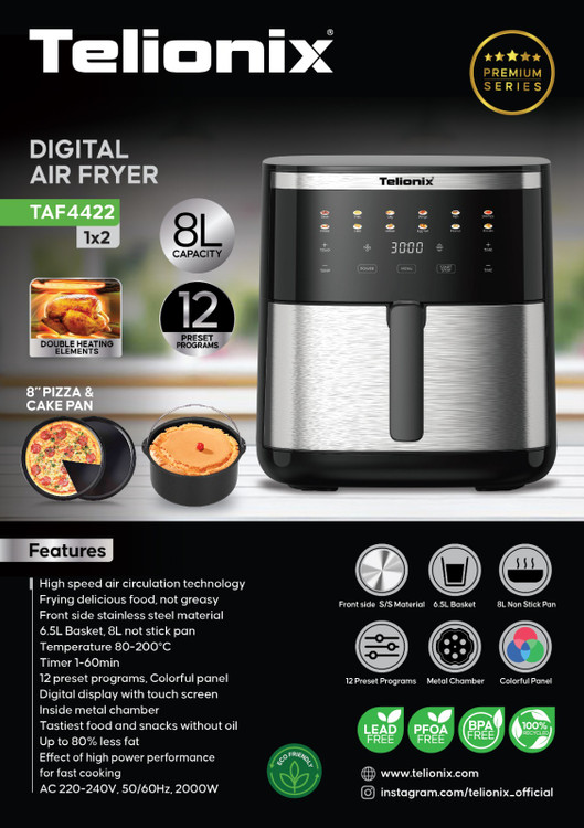 سایرمشخصات : تکنولوژی گردش هوا با سرعت بالا _ دما ۸۰ تا ۲۰۰ درجه سانتیگراد _ زمان یک تا ۶۰ دقیقه _ ۱۲ برنامه از پیش تعیین شده _ پنل لمسی و رنگی _ تا ۸۰ درصد چربی کمتر