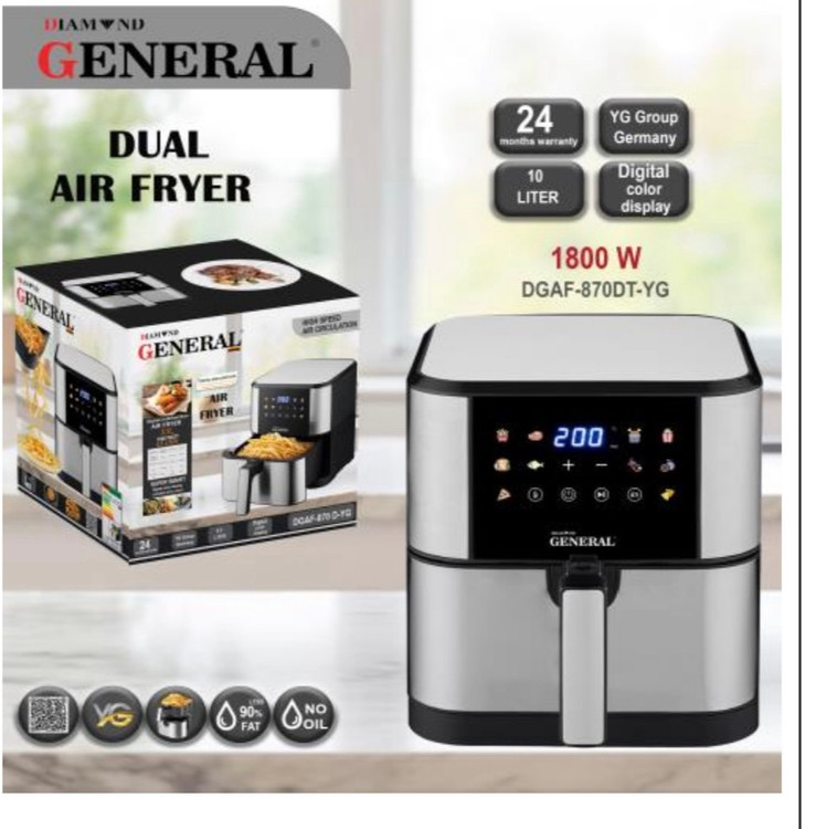 سرخکن جنرال با ظرفیت ۱۰ لیتری مناسب خانوادههای پرجمعیت یا مهمانیهای پر رفتوآمد طراحی شده است. این دستگاه به لطف المنتهای قوی با کیفیت بالا، پختی یکنواخت و سریع را تضمین میکند. از تهیه سیبزمینی سرخکرده تا مرغ برشته، از کیک خانگی تا سبزیجات گریلشده، همه چیز تنها با لمس یک دکمه آماده خواهد شد.